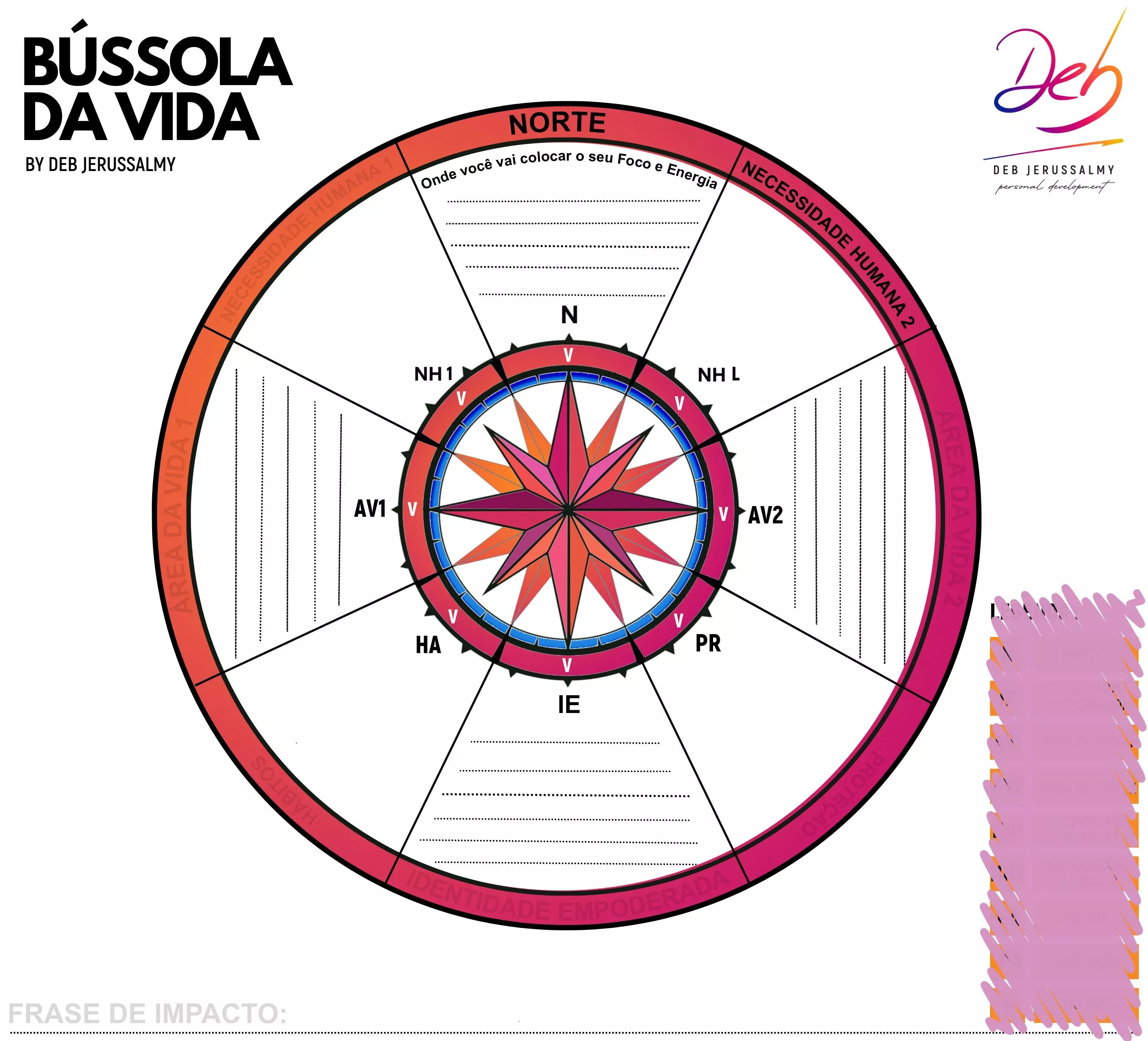 Com a Bússola da Vida, fica claro quais são as suas prioridades, os valores que embasam a sua vida e suas decisões, as suas principais necessidades e desejos, pra onde você tem que mirar o seu foco e energia daqui pra frente e o que precisa ser feito, ou seja, quais os hábitos e ações que vão fazer você chegar cada vez mais perto do seu Norte, sendo esse o seu objetivo ou seu sonho - mesmo que você ainda não saiba o que quer da vida, com a Bússola da Vida em mãos você terá uma clareza absurda.